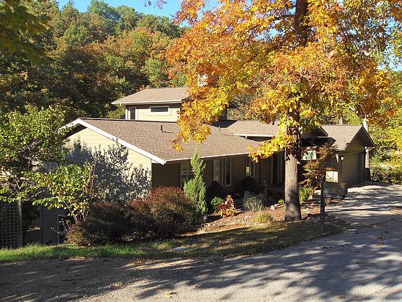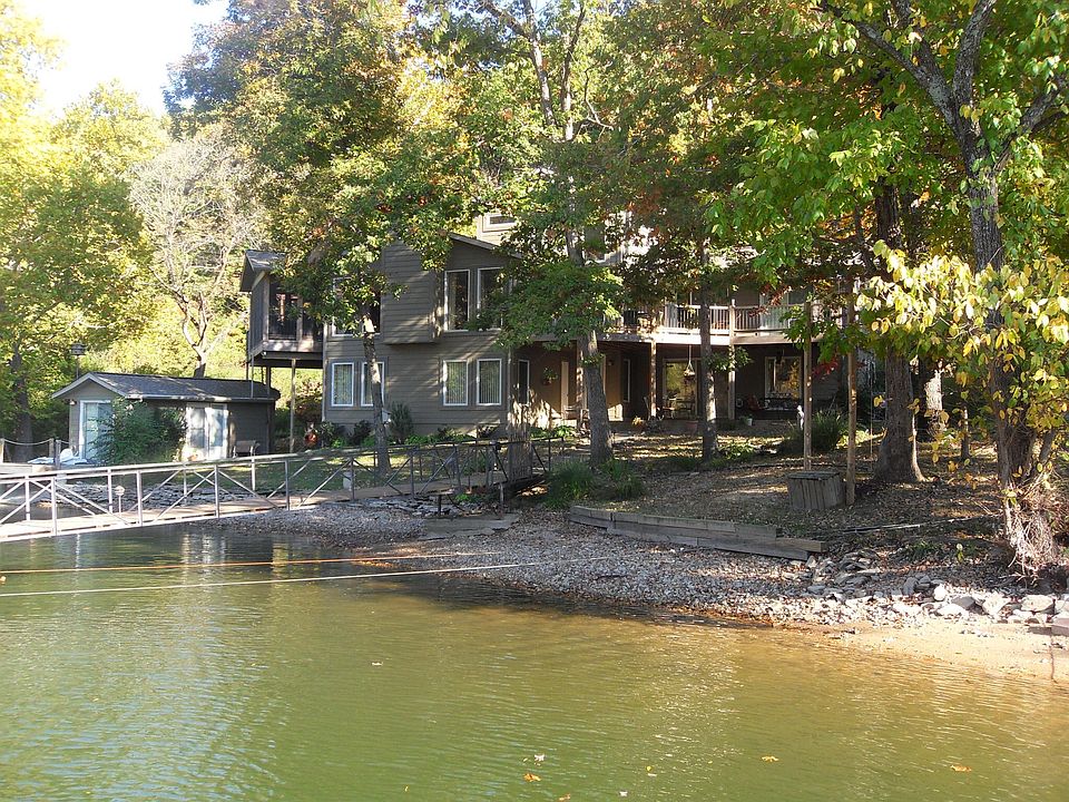 An Open plan Frank Lloyd Wright inspired house in a quiet private cove yet easily accessible to restaurants or other lake activities by car or boat. 120’ of year round shoreline accommodates the two level house and the adjoining guest house. Two complete living areas in the main house include two full kitchens and two laundry rooms make hosting guests easy. Atrium, cathedral and high ceilings enhance open plan.