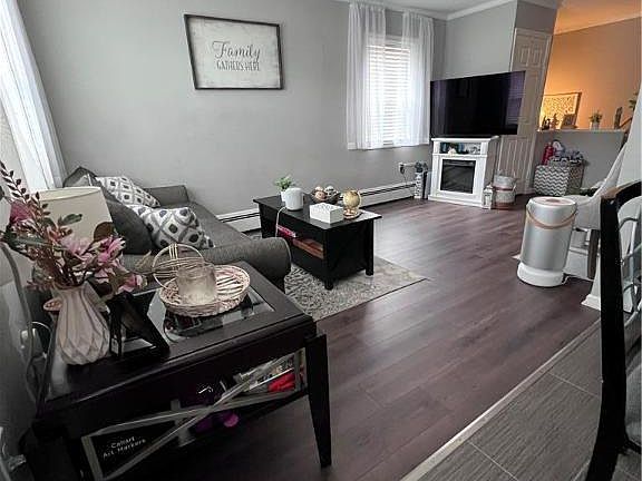 Welcome to this great starter, cozy, maintenance free end of row Brick home. This lovely property offers a blend of modern comfort and classic charm. The first floor bedroom considered a computer/office/exercise room and a utility room with an attached 1 car garage. Following the upstairs, you will find a contemporary eat-in kitchen/dining area, living room area, well appointed bathroom, a master bedroom with his and hers closet and another bedroom. The laundry chute adds a touch of practicality and convenience. This end of row brick features a newer roof and a recently serviced HVAC system ensuring efficient free climate control. The fenced in yard area is perfect for outdoor activities and privacy all making it a delightful home! Seller will provide a clear CO!