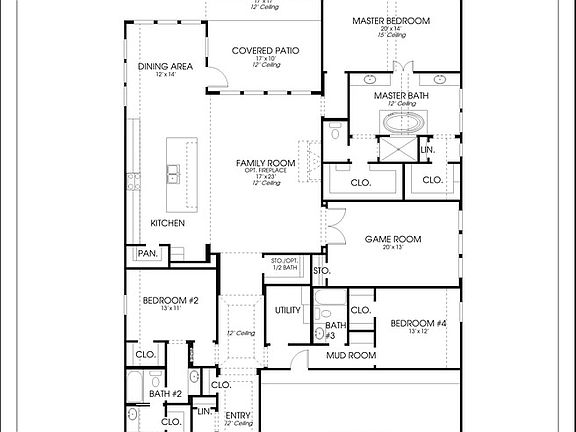 Extended entry with 12-foot ceiling leads to open family room, kitchen and morning area. Kitchen features walk-in pantry, two wall ovens, 5-burner gas cooktop and generous island with built-in seating space. Family room features a wood mantel fireplace and wall of windows. Game room with French doors just off family room. Primary suite includes bedroom with 15-foot ceiling. Dual vanities, freestanding tub, glass-enclosed shower and two walk-in closets in primary bath. A Hollywood bath connects to bedrooms two and three. All bedrooms feature walk-in closets. Extended covered backyard patio with 12-foot ceiling. Mud room off three-car garage.