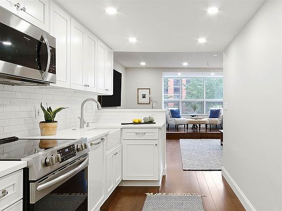 Conveniently located in Downtown Jersey City just outside Hoboken and walking distance to the Hoboken PATH and ferry to NYC, this 2 bedroom 1 bath rental has had a recent full renovation. The kitchen features brand new appliances including concealed dishwasher, garbage disposal, kraft-made cabinets, quartz countertops, farm sink and beautiful candied brick backsplash. The bathroom is immaculate with Carrera marble tile and built-in Bluetooth speaker lighting. Overlooking the lush courtyard, this freshly painted move-in ready home has all new floors, custom climate control blinds, in-unit washer & dryer and added recessed lighting throughout. Zephyr Lofts is a 24/7 doorman elevator building offering an on-site fitness center, and courtyard with BBQs. Utilities included except for electric. Rental garage parking available. Pet allowed with landlord approval and additional fee. Available for January 1 move-in with earlier flexibility. NO BROKER FEE.