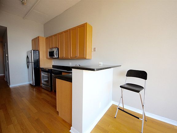 Bright and open one bedroom in true loft doorman building w/ soaring 13' ceilings. Living area w/ wall of glass that opens onto a large balcony with eastern exposure & beautiful sunset views. The kitchen features granite counters, breakfast bar, SS appliances. Central heat/AC & washer/dryer in the home. Gym on site, common landscaped courtyard w/ BBQ area. On-site Pkg available. Available for 4/1 move in!
