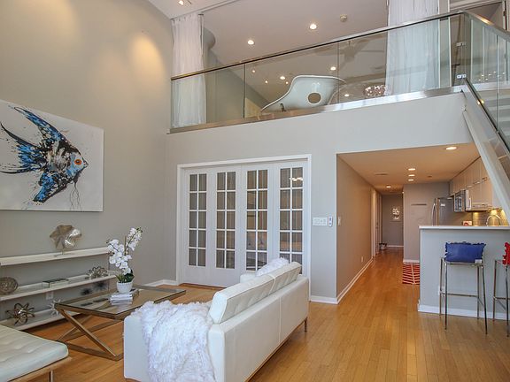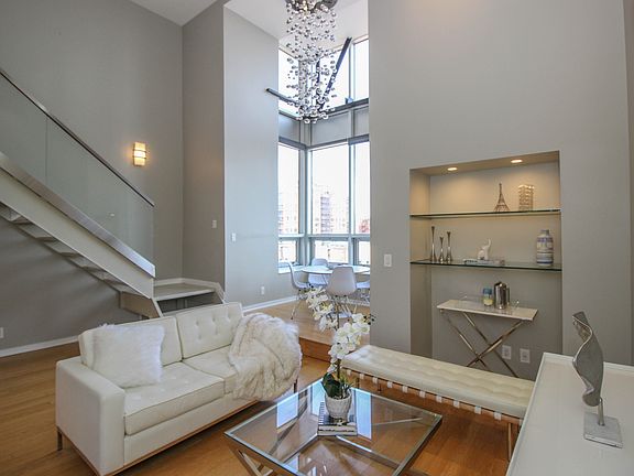 For showings txt 732-788-6560. Own the most stunning loft in Soho West: Apt 507 aka the Glass Loft at Zephyr Lofts. This 1475 sqft 2 bedroom (feels like a townhouse) with protected NYC Views features a stunning architectural glass railing, panoramic NYC views, 18 ft ceiling, 6 ft designer chandelier, a modern kitchen with quartz counters, acrylic soft close cabinets, Hafele hardware, built in dishwasher, undercabinet LED lighting, custom backsplash, French door fridge and new KitchenAid convection range. 2 full size marble baths feature Grohe hardware, custom vanities, designer lighting and Kohler sinks. 560 sqft master suite becomes fully private once you shut the hotel style curtain and locking door. Master bed includes dimmable recessed lights and 2 huge ELFA closets with automatic switch off lights. Custom glass and millwork shelves, h/w floors, CAC, full size W/D. Garage parking $250. Under 10 minute walk to Hob PATH. Maintenance includes heat, doorman, gym, bike storage, dog run and BBQ. Zephyr Lofts is a prime example of urban adaptive reuse of an industrial warehouse into a modern luxury residential building. This tax-abated (PILOT) building is super pet friendly.