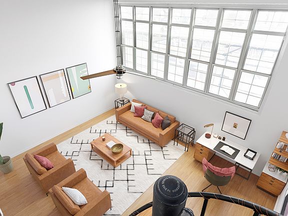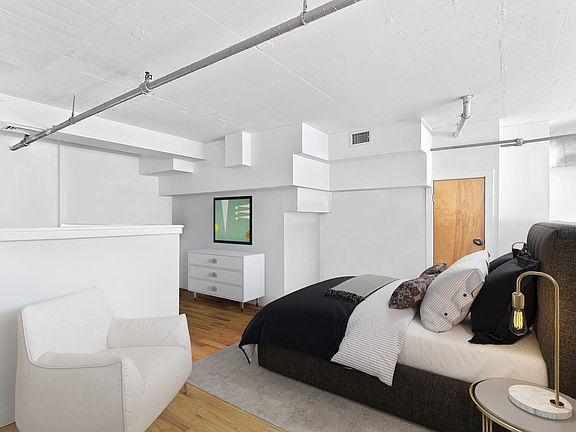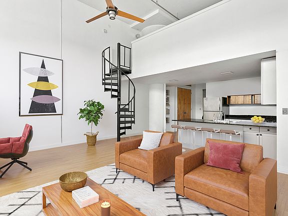 Finally, the Brooklyn loft you've been waiting for! Welcome home to unit #1D at 689 Myrtle Avenue, a stunning, sun-filled 982 square-foot 1-bedroom loft with soaring 17 foot high ceilings. Originally built in 1947 to support machinery used to produce Chocoline chocolate products, The Chocolate Factory was then converted to 45 Condos in 2003 and represents the classic tradition of the NYC Loft, characterized by open space, high ceilings, beefy walls, and large windows. The new cargo-sized elevator, dramatic high ceilings, wide hallways, exposed industrial-style HVAC ductwork, and ominous concrete columns create a raw and energetic feel. This one-of-a-kind airy home is flooded with natural light through its oversized eastern wall of windows and functions as a perfect live/workspace for artists and photographers or anyone who loves the loft lifestyle. The apartment features a sprawling living and dining room, gorgeous open-sky views, hardwood floors, iron spiral staircase that leads to the full height lofted king bedroom, an open kitchen with stainless steel appliances, including granite countertops, microwave, dishwasher, and ample shaker style cabinets. The bathroom features an over-sized six-foot by three-foot whirlpool tub with five jets. Apartment upgrades include Nest thermostat, designer ceiling fan, Samsung stackable washer/dryer, and hanging bike rack. A must-see apartment. Find your Zen in over 10,000 square feet of common green roof space, an oasis gorgeously landscaped with evergreen plants and fantastic panoramic views of Manhattan and Brooklyn including the Freedom Tower all wrapped around a one-a- kind private glass-enclosed fitness center with spectacular NYC views. Wired with TV, cable phone, and video intercom to the building's entrance, you'll never miss a package. With the G train at Myrtle-Willoughby only 2 and a half blocks away, Citibikes 1 block away and many bus routes nearby, 689 Myrtle Avenue is a convenient location at the crossroads of Bedford-Stuyvesant and Clinton Hill. Close to amazing neighborhood restaurants, bars, and coffee shops, we welcome you to make this very special unit your new home! Sellers paying one year worth of common charges for buyers.