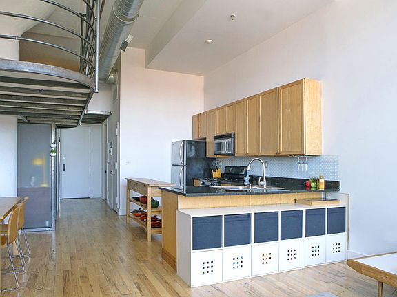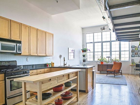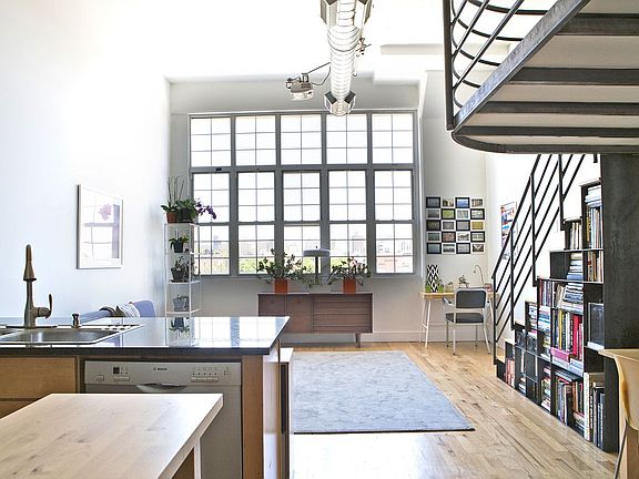 New to the market! Custom modern loft, with open space, bright light all day long, in a prime location. Welcome to The Chocolate Factory located on the border of Clinton Hill and Bed Stuy. Now is your opportunity to own a condo in this highly sought-after loft conversion. Originally built as a chocolate factory in the 1940's, it was converted into apartments just 15 years ago. This unit is unique, industrial and sleek, with all of the comforts of modern living. A property like this is few and far between. Enter unit 3B, a bright and glowing loft space that has been built out with a gorgeous steel and wood custom designed buildout to maximize the space. Currently used as a sleeping loft and office above, with a kids room below. The unit also has large amounts of storage throughout. 8 1/2 ft oversized windows are striking and welcome light to pour into the unit all day. 13 ft ceilings allow flexibility to the layout of the space. The monumental original columns are striking and a conversation piece on their own. There is a central heating and cooling system, controlled by a smart nest home thermostat, that maximizes efficiency. There is a large in-unit washer and dryer, and individual water heater. The elevator brings you straight up to the building's rooftop oasis - a gorgeous landscaped garden surrounded by unparalleled panoramic views of Manhattan and Brooklyn. Eat, drink, or relax while taking in the views from the benches or picnic tables, or be inspired as you work out in the giant glass-enclosed rooftop gym. The sunsets can't be beat! This 45 Unit building is pet-friendly and there is bike storage. The low monthly fees also include Fios! At the crossroads of bustling Clinton Hill and Bed-Stuy. Enjoy all that these neighborhoods have to offer. Wonderful restaurants, cafes, shops, galleries, The Pratt campus, the new Myrtle Avenue Pedestrian Plaza, Ft. Greene Park, the Y on Bedford Avenue, the Brooklyn Navy Yard, and the soon to open Wegmans Supermarket are all nearby. Be creative and inspired!