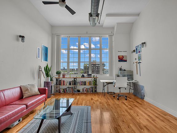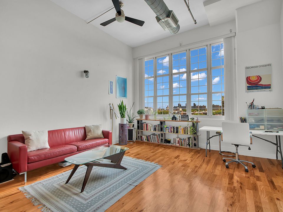 LOFT LOVERS DREAM This exceptional 830 sq. ft. condo loft with soaring 13 foot ceilings is now available for rent at The Chocolate Factory, positioned at the intersection of Bedford Stuyvesant and Clinton Hill. Featuring an expansive, sun-filled open layout with large windows and ample storage, this loft provides a spacious and airy living environment. The luxurious bathroom is complete with a relaxing jacuzzi tub, while the modern open plan kitchen is equipped with stainless steel appliances, a dishwasher, granite countertops with bar seating, and plenty of cabinet space for all your storage needs. Floor to ceiling windows in the living area offer picturesque views of Brooklyn's beautifully landscaped surroundings. This loft is thoughtfully designed to accommodate dining, cooking, and relaxing, combining functionality with sophisticated style. Originally constructed in 1947 and converted to loft residences in 2002, The Chocolate Factory Condominium offers one of Brooklyn's rare green roof decks, attracting crickets and butterflies. The rooftop gym, enclosed in glass, provides sweeping views of the Manhattan skyline, including the Freedom Tower and Empire State Building, along with a landscaped garden. Additional features include a video intercom system with mobile phone connectivity, 24/7 security monitoring, high-speed Verizon internet, a bike storage area, and rooftop WiFi, ideal for working outdoors with serene, panoramic views. The G train at Myrtle-Willoughby is just 2.5 blocks away, with various bus routes providing quick access to the A, C, F, Q, N, R, 2, 3, 4, 5, J, M, and Z subway lines within 10 minutes. Nearby conveniences include major grocery stores such as Whole Foods, Trader Joe's, Wegmans, Fairway, and Costco, alongside a range of organic markets and restaurants offering delivery service to your door. This open loft used as 1 bedroom condo is also located near the YMCA, Herbert Von King Park, Kosciuszko Pool, Fort Greene Park, the post office, pharmacies, Home Depot, Zipcar lots, parking garages, and Citibike stations. Don't miss the opportunity to rent your dream loft today!