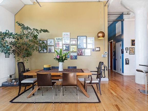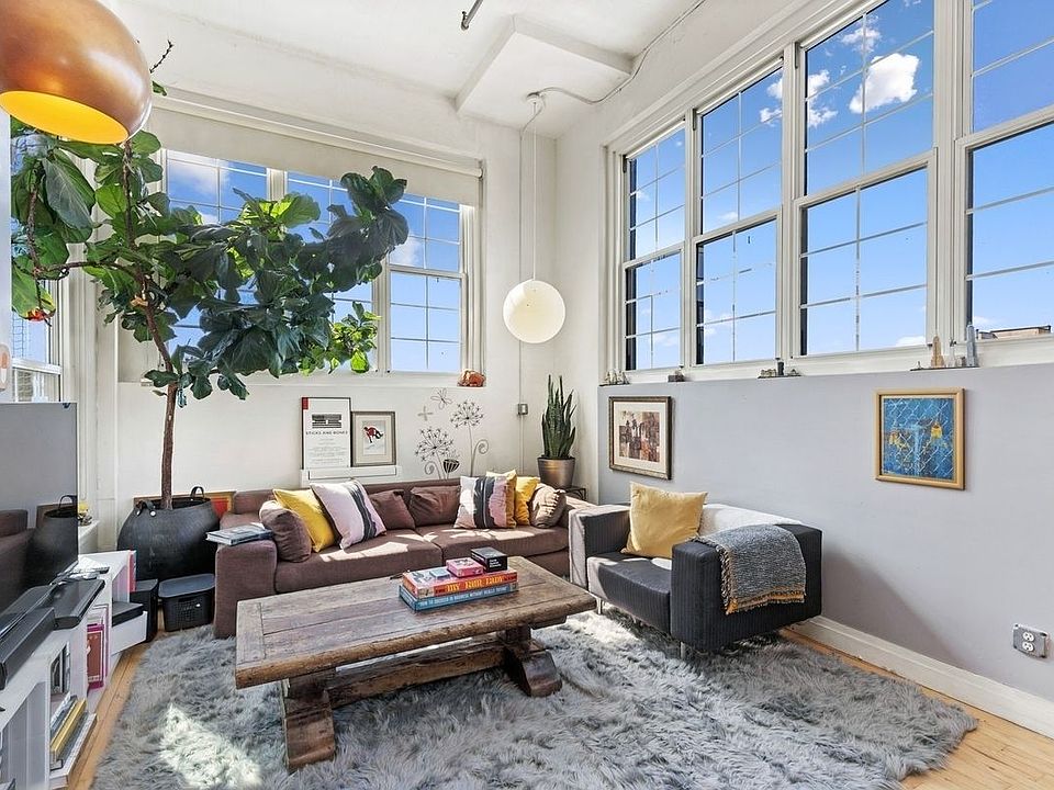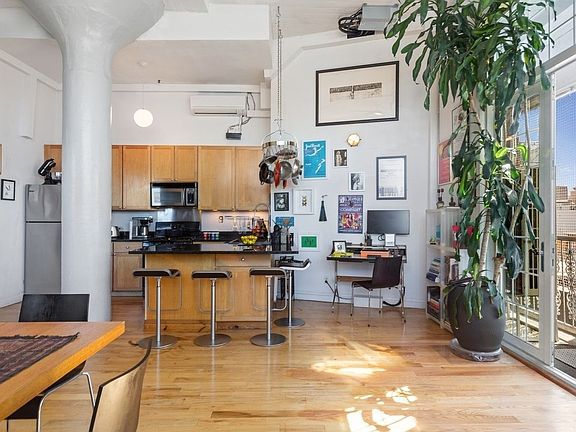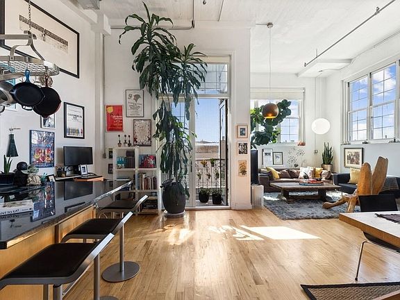 With a footprint of almost 1200 square feet and yards of windows facing Manhattan, this quintessential loft with 13' ceilings and industrial accents truly epitomizes New York living. The expansive hallway furnished with a magnificent solid oak pew offers a gallery for your artwork, access to a huge walk in closet, a stylishly appointed bathroom and functional washer dryer closet. Behind the gallery wall and, unlike many of the lofts in this building, there is an actual bedroom and it is gigantic! Enjoy it as is with an incredible wall of floor to ceiling Elfa shelving, or easily separate the space into two bedrooms. The living area is open plan with designated spaces for cooking, dining, working and lounging. The kitchen has ample closet space and a large island with a granite countertop and seating for at least 4 people. Adjacent to this is an office nook and then a cute balcony, perfect for a handy vegetable garden. The dining area is oversized with enough space for a large table and then finally, the corner lounge area is bathed in light from 3 aspects during the day and offers twinkling Manhattan views at night. The building has forced heat and air, yet this unit is the only one to have upgraded to a Mitubishi mini-split system which is efficient and whisper quiet. This upgrade freed up space for a 6'x3'x3' in-unit storage space tucked away up high. The Chocolate Factory was built in 1947 and converted to condos in 2003 introducing Brooklyn's first green roof--a unique 5000 sq. ft. tranquil garden space with panoramic views of Manhattan and Brooklyn plus a rooftop atrium gym, giving you everything you need right at home. The building's large capacity elevator makes for effortless moving in, visiting the roof deck or storing your bike in the bike room. There's 24/7 video security and high-speed Verizon Fios internet included in the building's common charges. Wifi is also available to all residents on the roof if you prefer to work outside. The building just completed a facade renovation which will last for years to come. Right on the border of Bed Stuy and Clinton Hill, the bar and restaurant options abound. Pratt campus and the shops and cafes on Myrtle Avenue are a short stroll away as is Herbert Von King Park and the Kosciuszko pool. Also conveniently located in the vicinity is Fort Greene Park, Wegmans and the Brooklyn Navy Yard. The G train is 2 blocks away. Bike lanes and CitiBike stations are also all at your door. You came to New York to live in a loft! Come and get it!