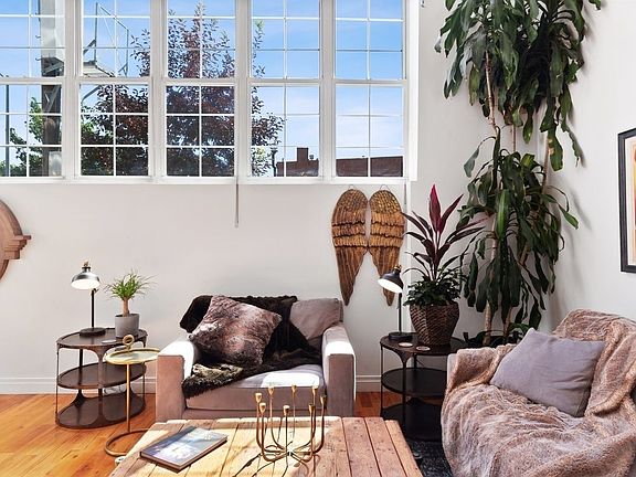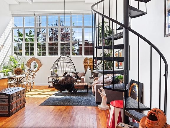 Owned by a juggler and an aerialist, the circus really is in town in this unique and wonderfully imagined 1222 square foot loft. Step this way into their version of the Big Top with 17' ceilings and light streaming in through a breathtaking wall of windows. On ground level, there's a newly renovated bathroom and a brand-new washer dryer, huge hallway closet, full ceiling height bedroom, a kitchen with a granite peninsula and an expansive living/dining room. Ascend the spiral staircase to a second full ceiling height bedroom with a custom walk-in closet. With walls this huge, who wouldn't want a projection TV? This loft comes with custom 10% light diffusing as well as complete black out blinds, so movie night parties are a cinch. An assembly used for aerialist silks is now holding a fun egg chair. The loft is at ground level, so avoiding the elevator is easy, yet privacy is guaranteed since the space cannot be viewed from the street. You can gaze at the heavens, but passers by cannot see in making it perfect for a rehearsal space, photo studio or any creative pursuit imaginable. The Chocolate Factory was built in 1947 and converted to condos in 2003 introducing Brooklyn's first green roof--a unique 5000 sq. ft. tranquil garden space with panoramic views of Manhattan and Brooklyn plus a rooftop atrium gym, giving you everything you need right at home. The building's large capacity elevator makes for effortless moving in, visiting the roof deck or storing your bike in the bike room. There's 24/7 video security and high-speed Verizon Fios internet included in the building's common charges. Wifi is also available to all residents on the roof if you prefer to work outside. The building just completed a facade renovation which will last for years to come. Right on the border of Bed Stuy and Clinton Hill, the bar and restaurant options abound. Pratt campus and the shops and cafes on Myrtle Avenue are a short stroll away as is Herbert Von King Park and the Kosciuszko pool. Also conveniently located in the vicinity is Fort Greene Park, Wegmans and the Brooklyn Navy Yard. The G train is 2 blocks away. Bike lanes and CitiBike stations are also all at your door. You came to New York to live in a loft! Come and get it! (*Please note, while this apartment is currently configured as a 2-bedroom, this property's legal description in the offering plan is a loft with one living area)