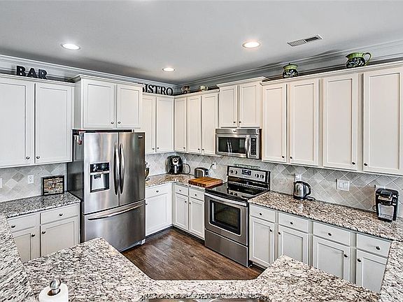 Fantastic 2-story townhome in desired location! Spacious open floor plan with 9' ceilings on main, hardwoods & 2 story foyer with arched doorway. New interior paint on 1st floor. Cozy up in the great room by the fireplace with gas logs or read the morning paper in the breakfast area that opens up to the private patio. Custom kitchen w/granite counters, tile backsplash, shaker style cabinetry, stainless appliances, eat-at island & large pantry. Upstairs owner's suite w/vaulted ceiling, walk in closet, awesome bath w/garden tub, large shower & double vanity. Relax out on your private patio or enjoy all the benefits of the clubhouse! Fitness center, community pool & an event room, perfect for hosting your next gathering!!