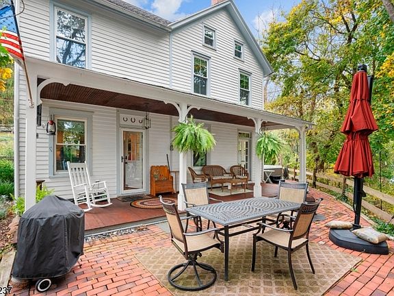 This charming colonial blends timeless character with thoughtful updates and inviting spaces for everyday living. The home's original section retains wide-plank pumpkin pine floors and the classic front door, creating a warm welcome the moment you step inside. A spacious foyer leads to a stylish powder room with pocket doors and an adjacent laundry area. The bright eat-in kitchen features soapstone counters, stainless steel appliances, pull-out storage, and a peninsula with seating for four perfect for casual gatherings. A formal dining room opens to a covered porch overlooking the Delaware River, setting the scene for relaxed dinners or morning coffee with a view. The living room's high ceilings, built-in bookshelves, wood-burning stove, and plantation shutters create a comfortable and elegant retreat. Upstairs, the primary suite includes a walk-in closet & en suite bath with a clawfoot tub, while two additional bedrooms and a full hall bath complete the second floor. A walk-up attic provides storage, & the partially finished basement adds a cozy den with radiant heat and Bilco doors. Recent upgrades include a BRAND NEW Carrier variable speed heat pump (forced air) AND central air, additional 3-zone oil burner w/ hot water radiators and radiant floor in basement. Newer hot water heater. Set on nearly half an acre with garden beds, ample parking, and a new saltwater hot tub, this hidden gem captures the charm of historic Milford living with river views and modern comfort.