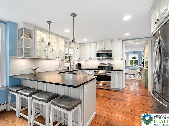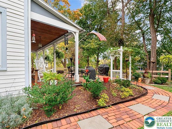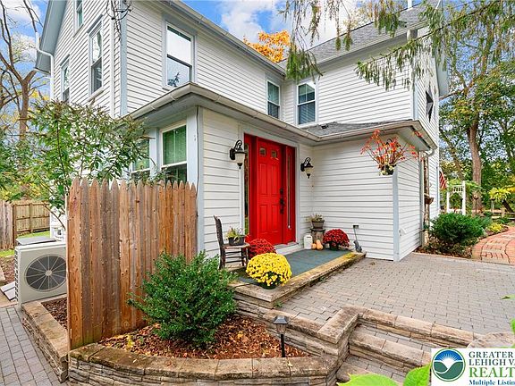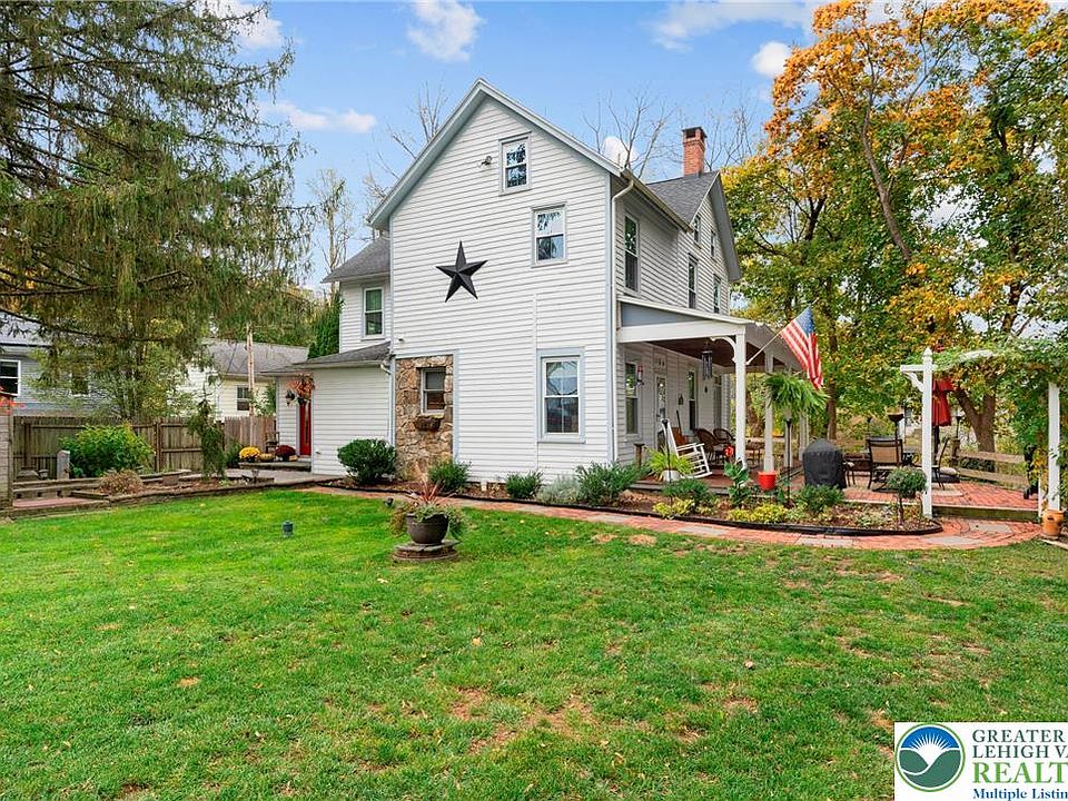 This charming colonial blends timeless character with thoughtful updates and inviting spaces for everyday living. The home's original section retains wide-plank pumpkin pine floors and the classic front door, creating a warm welcome the moment you step inside. A spacious foyer leads to a stylish powder room with pocket doors and an adjacent laundry area. The bright eat-in kitchen features soapstone counters, stainless steel appliances, pull-out storage, and a peninsula with seating for four perfect for casual gatherings. A formal dining room opens to a covered porch overlooking the Delaware River, setting the scene for relaxed dinners or morning coffee with a view. The living room's high ceilings, built-in bookshelves, wood-burning stove, and plantation shutters create a comfortable and elegant retreat. Upstairs, the primary suite includes a walk-in closet & en suite bath with a clawfoot tub, while two additional bedrooms and a full hall bath complete the second floor. A walk-up attic provides storage, & the partially finished basement adds a cozy den with radiant heat and Bilco doors. Recent upgrades include a BRAND NEW Carrier variable speed heat pump (forced air) AND central air, additional 3-zone oil burner w/ hot water radiators and radiant floor in basement. Newer hot water heater. Set on nearly half an acre with garden beds, ample parking, and a new saltwater hot tub, this hidden gem captures the charm of historic Milford living with river views and modern comfort.