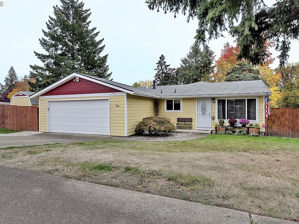 Charming one-level; move-in ready! Great Room style with open Kitchen/Dining/Family Room. Unique wood accent wall surrounds fireplace & slider leads to terrific fenced yard featuring a newer covered deck & firepit! Loaded with updates throughout; fresh interior paint, new stainless appliance suite, laminate flooring,closet organizers,new fixtures, new furnace/AC, newer siding/exterior paint & vinyl windows! Be prepared to fall in LOVE!