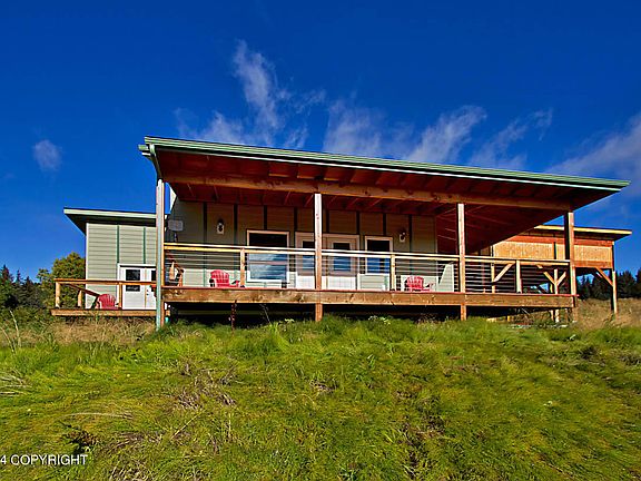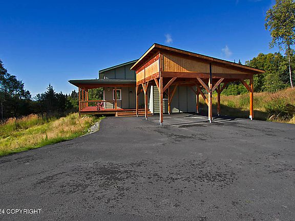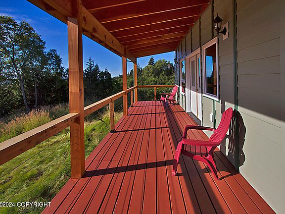Enjoy gorgeous views of the bay and ocean from this inviting and efficient 2BR/2BA ranch home situated adjacent to a beautiful natural greenbelt. You will love the privacy of the setting, the spacious front porch, and the private deck off the primary BR. On city utilities w/ natural gas heaters in the living room and both BR's to keep you warm and cozy throughout the winter! Plus a 2-bay carport!Built in 2023, this lovely home features fantastic outdoor living space, a 2-vehicle timber post carport, and a large paved driveway for easy in & out. Paved streets throughout the subdivision make your short hop to downtown a complete breeze. Easy one-level living with an open floor plan, office nook off the living area, spacious laundry room, solid surface counters, stainless appliances. Double doors in the living area lead to a delightful front porch that runs the length of the home and around the corner to the front door. In addition, a very private TREX deck off the primary bedroom allows you to step outside with your morning tea or coffee and tune in to the sights and sounds of the natural landscape adjacent to the home. This property is located in "Quiet Creek Park," one of Homer's newer, most beautiful and well-designed neighborhoods with high quality homes, paved streets, and stunning views of Kachemak Bay at every turn. Extremely convenient to the center of town but feels like a world away!