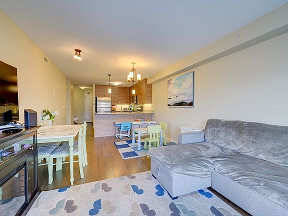 Lovely east facing Library Square 2 bedroom, 2 bathroom condo featuring an open floor plan and spacious deck. This unit includes hardwood flooring throughout. The main living space has an open floor plan with a U shaped kitchen that has a lot of storage and stone counters. The living and dining room space have a large picture window for natural light and there is access to the patio. There is a main bathroom that is 4 pieces and the primary bedroom features an ensuite with walk in shower. This unit has it';s own laundry room, 1 secure underground parking stall (stall 92) and one storage locker (locker 246). Other amenities in this building include a community room with large patio for gatherings and celebrations and secure bike storage in the parking garage. This unit is steps to local shopping and transportation. Unit is priced for a quick sale.