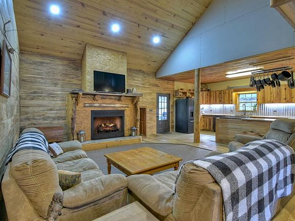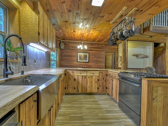 Cozy and Quaint...this rustic charmer oozes potential galore...4 bedrooms/3.5 baths + half bath off inviting foyer area, master on main with private bath, 2nd bedroom on main perfect for guest or home office, etc, rustic kitchen features custom & unique hickory cabinetry and hickory counters with new appliances and large farmhouse sink, great room with warm fireplace and all wood interior, plentiful windows for light and bright interior, open loft on second floor leads to two large bedrooms each with private baths, full ready to finish terrace level leads to concrete patio and gentle low maintenance yard area with generous garden area, wrap porches with country feel and mountain views, easy mostly paved access with gentle driveway and lots of parking, still room to decide on interior flooring or make it your own...needs some finishing touches...this one could be all yours!