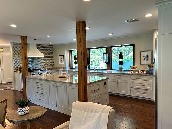 What a jewel we have at 689 Zetus Road . This midcentury brick ranch home has been remodeled with impeccable taste as the architect blended this transformation. The 4 bed/ 3 bath arrangement claims 3103 sf, an open kitchen with shaker style cabinetry and granite countertops, built in refrigerator, gas oven with water spout, two dishwashers, instant hot water, warming drawer, appliance garage/cupboard with coffee station, and ice maker...but that doesn't cover everything. Overlooking the kitchen island we have a comfortable and spacious dining and keeping room with raised brick hearth and wood burning fireplace and a beautiful wood mantle. This east side also has double garage with storage and room for just about anything.seriously your storage room has storage rooms. Across the dining, and through the barrel ceiling refreshment center we have another room for relaxing, unwinding, entertaining and gathering. The tremendous wall of windows and doors across the back indeed brings nature inside. The flooring throughout is uniform and tasteful and durable, the color scheme neutral and soothing to suit, the windows have also been replaced to confirm the totality of the remodel. The front foyer looks out onto a front courtyard with fountain and gas lights tucked neatly behind a concrete fortress wall. The over acre and a half site goes on and on and on. Hidden by a row of Elaeagnus along the road, one can only ponder the grandeur that lies ahead.