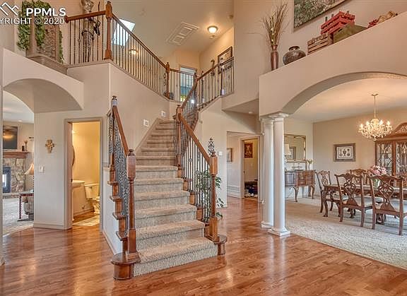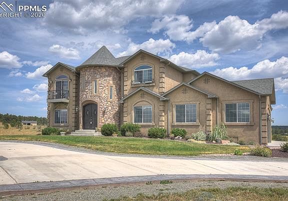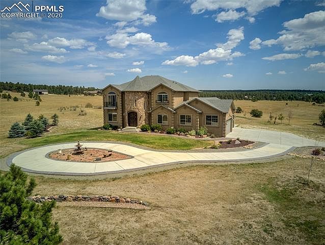 D20 Schools, check. Unobstructed Pikes Peak and Front Range views, check. Acreage just outside of town, check. Hospital and shopping right down the road, check. High quality custom home, check. Move in ready (no honey do list), check. This exceptional custom property in Eagle Wing Estates is a must see! VIEWS**VIEWS**VIEWS** You can see Pikes Peak & the Front Range down to Spanish Peaks. A castle on a hill with over 2.5 acres and zoned for horses. Meadow views out back and side. Big driveway w/circular front drive around beautiful front yard water fountain. Flat private back yard. Big deck off back w/ 2 way Fireplace. Covered walkout 19X9 patio. Engineered Septic. Gas line on Deck. Stamped colored concrete. Walk thru double metal doors into a vaulted Entry w/ a Notre Dame Chandelier & Italian marble mosaic inlay. Main level office w/knotty alder built-in bookcases. All interior doors are solid wood. Slab granite in kitchen w/ Island. Stainless appliances including gas cooktop. Butlers pantry, Built-in desk and big walk-in Pantry. Spacious family room w/ 2 way stone fireplace to deck. Large Master suite w/ sitting area and private balcony w/stunning views. 2 way stone fireplace between master bed and bath w/jetted tub and double vanity w/makeup counter. Upstairs bedrooms include large Jack-n-Jill bath. Upper laundry with counters, cabinets and sink. Walk out basement with big family room w/large wet bar. 2 more basement bedrooms share a full bath. Entire house has PENGUINS COAT INSULATION (keeps home cool in summer & warm in winter)2 FURNACES 2 A/C PREWIRES Surround Sound Prewire in Family Rm & TV RM Hot Tub Prewire on Patio. House wired w/ Cat 6E. Alarm wiring includes Fire & Carbon Monoxide. Just under 1000 sq ft 4 Car Garage is extra deep in 2 stalls & is finished to texture & paint. Under Eave outlets on switch for Xmas lights. THIS HOME IS LOADED!