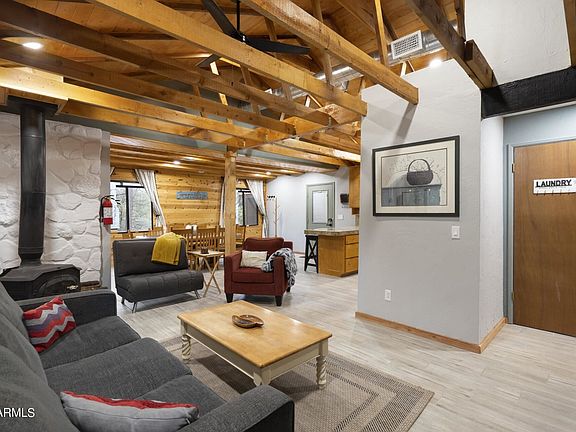 Fully furnished, remodeled, move in ready cabin that backs up to Tonto National Forest access road. 2 bed/2 bath +den/bonus roomGreat location for outdoor lovers and off roaders. If you want a short term rental this has gotten great reviews. Great for second home or primary residence as well. Brand new kitchen appliances, open floor plan, and beautifully open ceilings. Enjoy the wood burning stove in the welcoming living room. You will find brand new tile floors throughout, and a full size laundry room with washer and dryer. The master bedroom has a walk in closet and sliding door to the beautiful patio to enjoy wildlife in your yard. Both bathrooms have been beautifully remodeled and are your oasis. Bonus game/storage room off the patio!Large lot !!Paver driveway nearly complet