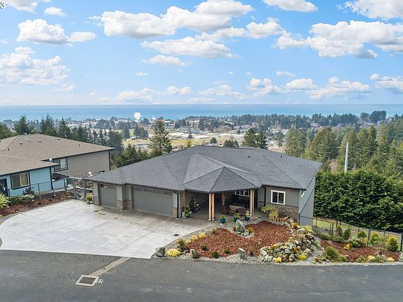 There is currently a "bumpable" offer in first position that will expire on 06/08. Sellers encourage any interested parties to schedule a showing and present offers now! Extraordinary Views of Pacific Ocean and City of Brookings. Impeccable, elegant, and newer 2500+ SF home situated in an upscale, gated community. Abundant natural light throughout and finishes that satisfy the most discerning palette. Family and kitchen areas provide access to expansive, covered, lighted decking to take in sunrises and sunsets and all moments in between! Attractive open concept living, Cook's Kitchen engages with Family Room via open floor plan. Primary Bedroom affords panoramic Pacific Ocean and city views and deck access. En Suite primary bath is exquisite with soaking tub, heated stone flooring, "curb-less" stone shower, and large walk-in closet. Guest bedrooms at separate end of house from primary bedroom. Guest bedroom on southwest side of home provides beautiful Pacific views for your company! Laundry room is very spacious with quite a bit of storage. Main floor office could be the 4th bedroom and plenty more storage in 3 vehicle, over-sized garage. Xeriscape low-maintenance landscaping throughout the property and the un-finished basement is perfect as is for a shop and storage...however, it may be possible to convert the basement to another 1000+ SF of living space (check with contractor and city). You won't be able to buy land and build a home of this caliper, with these elegant finishes, at a cost anywhere close to what this beautiful home is being offered for. Qualified Buyers call today for your private tour!