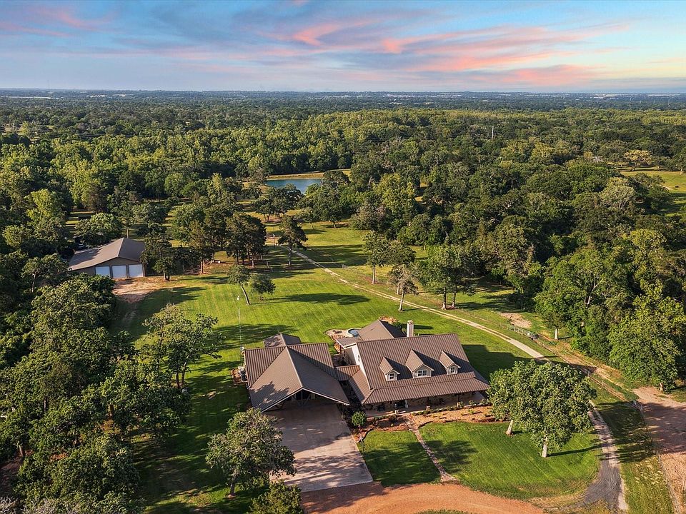 Just a 45-minute drive from Katy. 43.66 fenced acres of scenic countryside, this one-of-a-kind 6,633 sq ft custom steel-frame home combines luxury living with ranch functionality.
