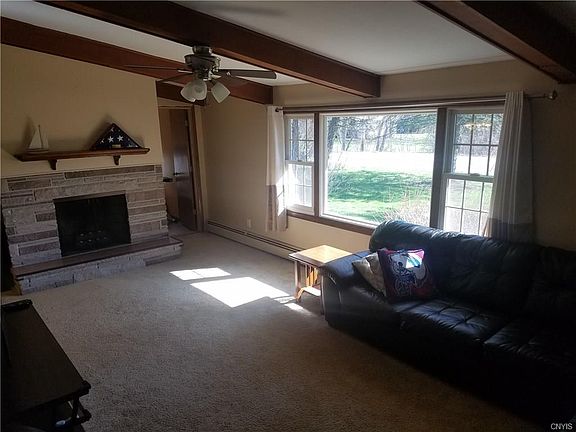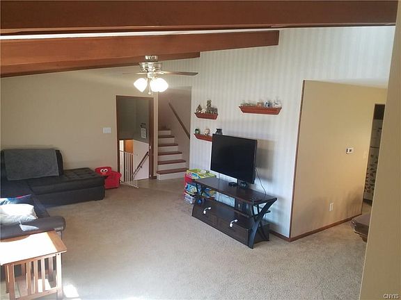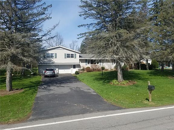 Charming split level home with ample space both indoors and out. Enjoy the sunsets from the comforts of a large three season room overlooking the expansive yard. Four bedrooms with beautiful hardwoods compliment the freshly tiled bathroom upstairs. Spacious kitchen with a double oven, cook-top and a breakfast or coffee bar leads into the dining room and large living room with vaulted ceiling. Beautiful setting with 1.3 acres on a quiet road yet still close to 690. Home is currently being used as a single family home, but is zoned for multifamily. Easy to convert back to an in-law suite, or rent out a portion of the home for extra income.