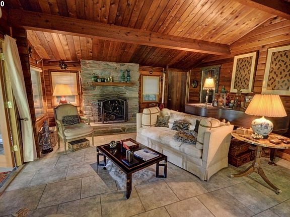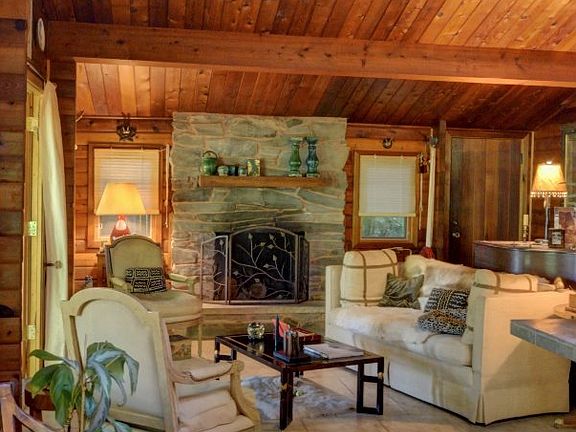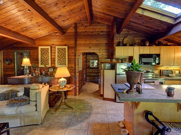 Restored mid-century cedar log Panabode cabin on one third acre with golf course frontage. No HOA! Two bedroom, two baths. Open floor plan with vaulted ceilings and large windows. Stone fireplace. Upgraded kitchen with granite counters and island, stainless steel appliances, and maple cabinets. Radiant heated tile floors throughout. Skylights, French doors to potentially enclosed porch. Big sunny deck. Outbuilding for toys and wood. Perfect full time or vacation home!
