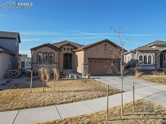 This beautiful stone and stucco home is pristine from the moment you enter into the front entry way. Through the entry way the home opens into a spacious living room with stone fireplace and expansive window filling the home with natural light that flows into the eat in kitchen. The kitchen has ample cabinet and counter space with a wonderful barstool height center island. The dining area has a door that opens out to the back porch. The main level also boasts three bedrooms and two baths including the master bedroom and ensuite bath. The basement is unfinished with myriad options for completion as it is already plumbed for a third bathroom. The basement walks out into the backyard onto a beautiful patio and fully landscaped yard with water feature. The solar panels on the home are also an added bonus as they significantly decrease the cost of electric and will be transferred to buyer fully paid for! This property has it all and is minutes away from schools, hiking/biking trails, pools/parks, pickle ball courts and dog park. This home is located in the Banning Lewis Ranch community with amenities galore, including neighborhood schools, over 75 acres of parks/trails/open space, tennis courts, basketball court, rock climbing parks, zip-lines, access to pools, splash pad, water park, and dog park. Recreation center houses a fitness center and also regularly hosts classes and events for all ages. In the summer months, catch a neighborhood concert, festival, food trucks, farmers market or enjoy other regular community events. This community has it all.