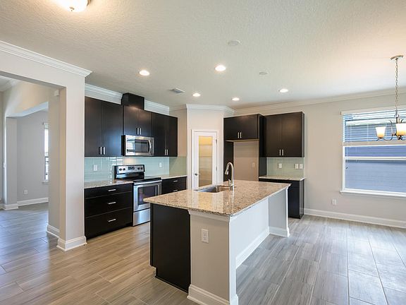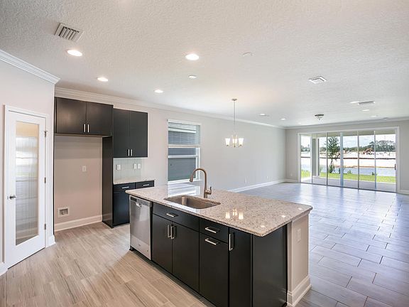 Open, airy and spacious "Seagate" floor plan with water view. 42" espresso kitchen cabinets, pull-out trash can, glass backsplash, contemporary hardware, stainless steel appliances, gorgeous 12"x24" tile flooring in the main living areas of the home. Beautiful 12 foot wide by 8 foot tall sliding glass doors leads to covered rear lanai. The owner's suite features two large walk in closets as well as a shoe closet and the owner's bath has an upgraded semi frameless shower, oversized vanity with double sinks, and huge soaking tub. The foyer, kitchen and family room showcase crown molding. Home is ready now!