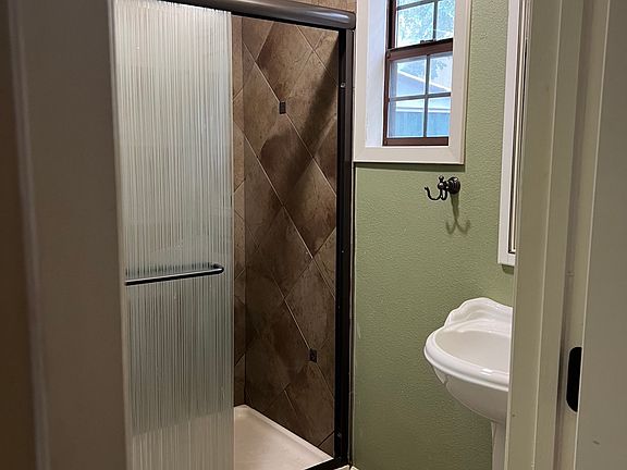 Bathroom has walk-in shower with sliding glass doors, a pedestal sink, and floor to ceiling built-in shelves.