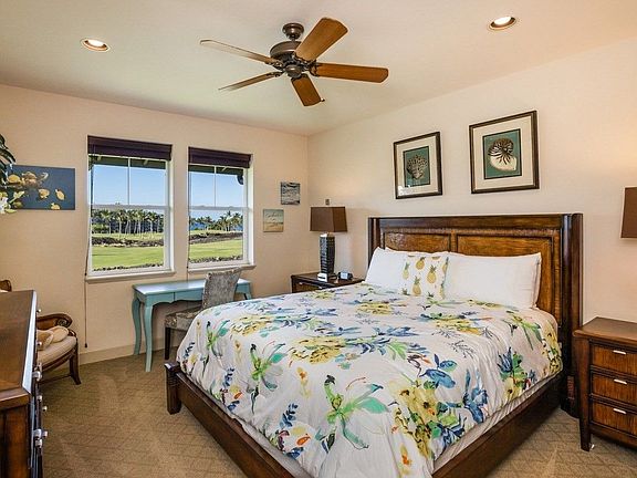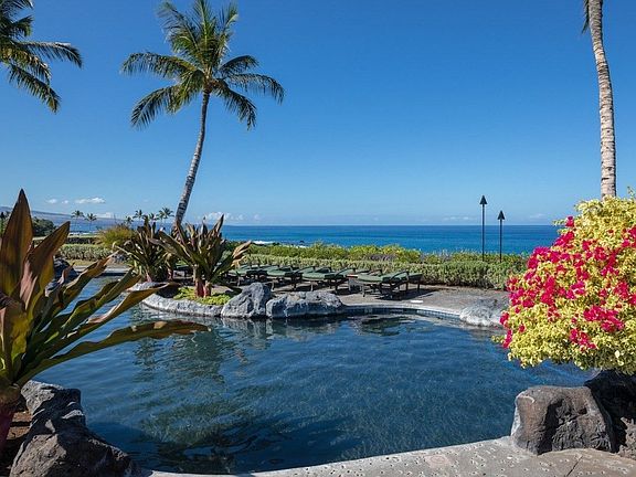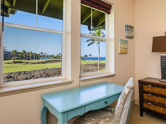 Enjoy beautiful sunsets from your impeccably furnished luxury Halii Kai almost-oceanfront villa!Enter your well-appointed spacious two bedrooms and two bathrooms villa and step into your inviting gourmet kitchen, dining area, and main living area with closeup superb views of the Mauna Kea mountain, Waikoloa Beach Course' signature hole Hemolele (means perfection) and of course ocean. The tiled lanai boasts a BBQ grill for an outdoor dining while enjoying sunrise over Mauna Kea and sunsets over the ocean.Indulge in all that this ocean front community provides! The exclusive Ocean Club where their lagoon-style pool with waterfalls, cool aqua-loungers, spa/hot tub, keiki wading pool, top-of-the-line Exercise Hale, and Ocean Club Bar and Grill is just a short stroll away! Kings Shops, Queen Shops, Anaeho'omalu Bay, water sports, world class fine dining, golf, luxury cinemas, and shopping are close by that you can walk, bike, or short drive to.This unit is perfect as a primary residence or for use as a vacation rental. Sold furnished.