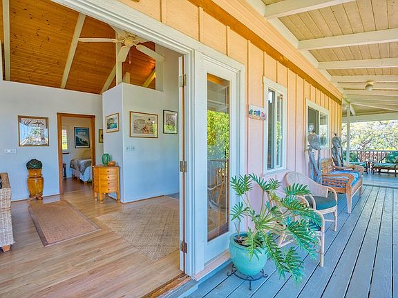 Built in 2002, this residence is on 14,000 square feet of land. The cathedral ceiling creates spaciousness in the living room and kitchen, while glass sliders let the sun-filled light in. Upstairs are two bedrooms and a bath with wrap-around decks offering many spaces to relax and/or entertain. A corner of the living room has two punee (traditional Hawaiian daybeds) creating an Old Hawai’i feel. The primary bedroom with its own access to the large lanai overlooking the pond. The second bedroom was built as a “bunk room” for weekend family jaunts to Puako.