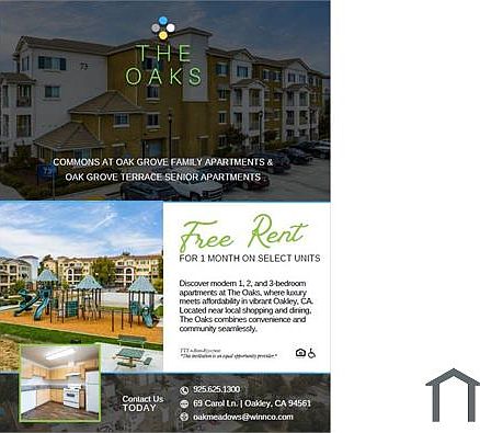 The Oaks Apartments Come out to tour and apply today! No appointments required, walk ins are welcomed!We are open Monday- Friday from 9:00am-4:00pm and Saturday 10:00am-3:00pm.You can visit us at 69 Carol Lane, Oakley, CA 94561.*Move in special ends 6/30/2025! For more properties like this visit Affordable Housing.