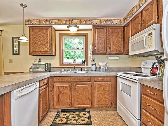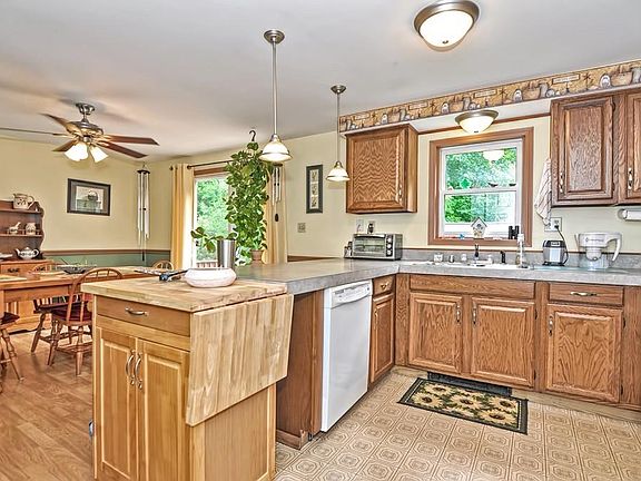 This home is ready for it's new owner to move right in! The main floor has an open layout with a functional kitchen, eating area, and large living room all with plenty of natural light streaming in the bay windows and slider. A large pantry adds extra storage in the kitchen. Three well sized bedrooms are also located on the main level. The bathroom has tons of storage with double sinks and a linen closet. The master bedroom is located at the back of the house and has a great walk in closet. Downstairs half of the basement has been finished with tile flooring and a space to add a wood or pellet stove. The other half could be finished or used for more storage. The laundry is also located in the basement. The exterior is easy to maintain with vinyl siding, a small yard and shed. A freshly painted deck is great for entertaining.