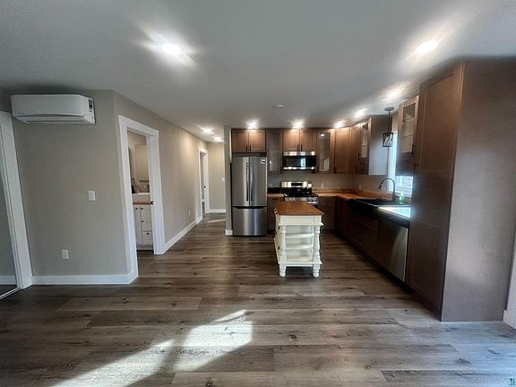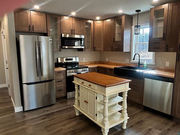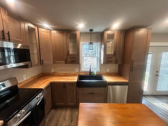 - Description: Kitchen Dining room Combo. Butcher block counters, Farm house sink, New Appliances. In floor heat