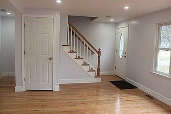 This half duplex is Move-in Ready! This charming townhome features an open concept living room/kitchen with fresh paint and recently refinished hardwood floors. The spacious kitchen boasts newer all stainless steel appliances, center island with room for seating and lots of cabinet and counterspace for storage. Half bath located on first level. Back door opens to a large trex deck and yard, perfect for relaxing. Upstairs offers three generous bedrooms and 1 bath. The finished lower-level family room with tile flooring adds extra living space. Washer/dryer hookup are also on lower level.This unit offer gas heat and central air for year-round comfort. This home is close to shopping, dining, schools, and public transportation. A fantastic opportunity book your showing today!