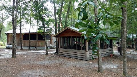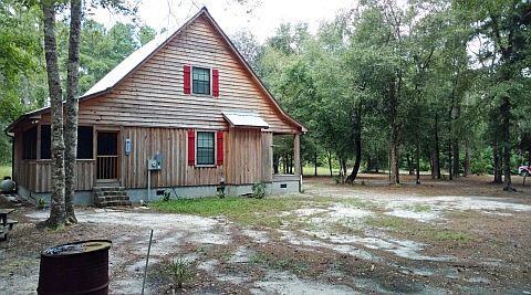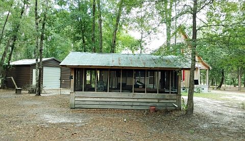 Nested in a quiet and remote area, Reeves Landing is a 2 story wooden cabin with pine interior and cypress board & batten exterior. 3 bedroom and 2 bath. Master bedroom downstairs, 2 bedrooms upstairs, perfect for the kids. Plenty of room to play. Separate screened in cook shed in the back. Perfect for grilling, frying up fish, and just eating and having a good time entertaining guests. Enclosed metal carport for your boat that can be used in the historic Suwannee River, within walking distance. Okeefenokee Federal State Park is only a few miles away as well! RV electric & septic tank hookup available.