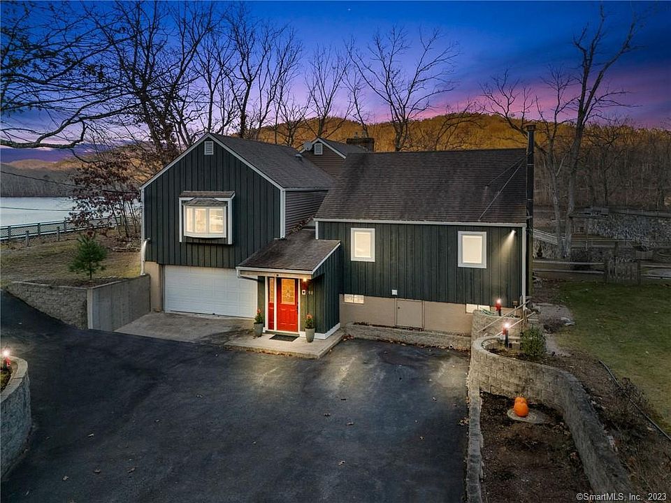 This stunning waterfront property, situated at the end of a quiet cul-de-sac, boasts breathtaking sunset views and great access to Long Pond. The home features a contemporary design with 4 bedrooms, 2.5 bathrooms, and spans 2,086 square feet on a generous 1.25-acre waterfront lot, including two private docks and sandy beach. The kitchen is upgraded with stainless steel appliances, including a Bosch dual-fuel five-burner gas range and double wall oven. Other recent interior renovations include new flooring in the kitchen, family room, master bedroom and a remodeled master bath. Exterior enhancements include newer windows, gutters, cedar deck and fencing. The living space is designed for both elegance and comfort, featuring a gas fireplace with a striking brick hearth that extends up to the cathedral ceiling. The dining area merges seamlessly with the living room, offering an ideal space for intimate dinners or entertaining. The kitchen also includes a breakfast bar for casual dining. The layout comprises three bedrooms on the main level, one of which opens to a private deck. The secluded master suite on the upper level includes a bow window, high ceiling, and a full bath. Additional living space is available in the lower-level family room, complete with a gas heat stove and walk-out to a patio. This leads to granite steps and a vast terrace area, offering 360-degree views and direct access to the waterfront beach and docks, all beautifully lit for evening entertainment. This property is perfect for both relaxation and hosting, with features like central air, Thermopane windows, efficient hydro air heating, two-car garage, two storage sheds, and a whole-house generator backup system. It's ideal for outdoor enthusiasts, with ideal opportunities for kayaking, canoeing, paddleboarding, swimming, fishing, and ice skating, with commercial lighting along paths and terraces. The location is conveniently near Foxwoods, Mystic, and major employers like Electric Boat, Pfizer, the Naval Submarine Base, Mohegan Sun, and local hospitals.