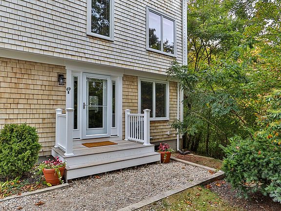 Newly renovated from the studs out - all new walls, floors, ceilings and doors, and everything in between! Spacious light-filled townhome, part of a two-unit association, has undergone a complete renovation including electrical and plumbing systems, with every finish and amenity carefully selected and custom woodwork throughout. The home has three levels of living plus a full basement with walkout. Enter the main level sunlit living space with coffered ceilings, recessed lighting, dining area and spacious kitchen with peninsula, quartz counter tops, stainless appliances and glass block backsplash. Through patio doors is a custom-built screened porch with tongue and groove ceiling overlooking conservation land, offering total privacy and ideal for entertaining and relaxing. The next floor has 2 generously sized bedrooms each with two sets of windows, along with a shared hallway bath with tub /shower. The stairwell features custom paneled walls and hand railing. The top floor is dedicated solely to the spacious primary suite, with a cathedral ceiling and shed dormer, primary bath with shower and porcelain tiled floor, custom bookcases, walk-in closets, and a large seating area.