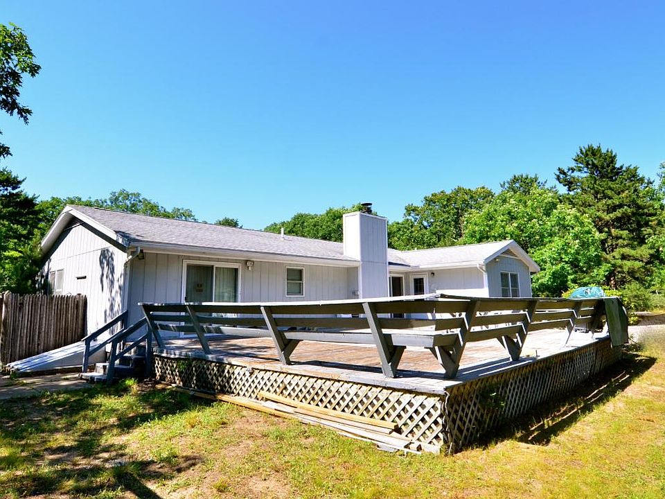 WEST TISBURY - Four Bedroom, Single Story home on just under an acre of land, a lovely wooded level lot, within walking distance to Up Island Cronig's. You'll be pleasantly surprised when you walk into this house to see its great layout. The living area is large enough to accommodate four separate functions... Kitchen, Dining area, TV area and second sitting area...all in one large, open space. Kitchen is well laid out with an island facing the main living area. Wood burning fireplace in tv area and slider to large deck. Master Bedroom with ensuite and slider to the enormous deck. Three guest bedrooms are a really good size. The house appears to be in very good shape but upgrades might be desired for each of the bathrooms. Huge 1,760 sq.ft. basement. Shed and outdoor shower. Circ