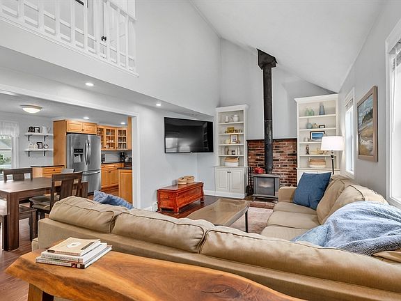 Don't miss this stylish home nestled on a corner lot in a sought after neighborhood with deeded beach rights! This charming property has numerous updates and a bright open floor plan. The soaring ceilings and wood stove in the living room create an inviting ambiance, and flow nicely into the dining area and beautiful kitchen. There is also a pantry and prep area adding to the functionality of the space. Upstairs are two nice size bedrooms and a second bathroom. The full basement offers additional living and storage space with workshop. In addition is a fabulous shed with electricity and wiring for a generator. Situated on over a half acre corner lot with picturesque stone walls, this home provides ample outdoor space for relaxation or recreation. There are deeded beach rights to Mystic Lake and surrounding nature trails, tennis & basketball courts, making this Cape Cod living at its best. Septic has passed and is designed for 3 bedrooms.
