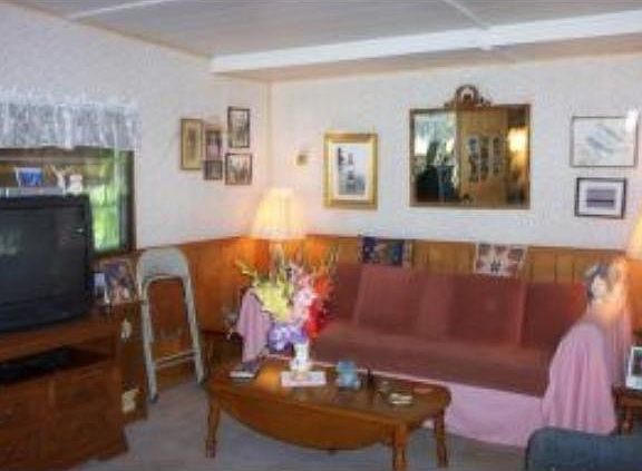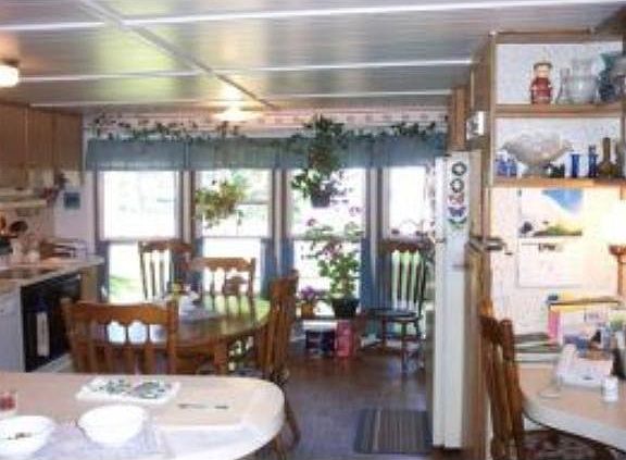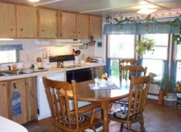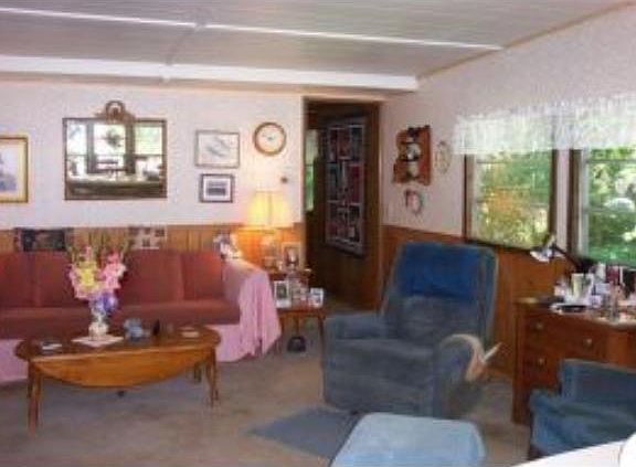 Why pay rent when you can own for less? There is no park fee here. Public Water and sewer. Nice open kitchen with plenty of cabinet space and open concept into living room. 3/4 bath with laundry. Partial basement with walk out for extra storage below. Hear the relaxing sound of the river below. Home needs some cosmetic TLC.