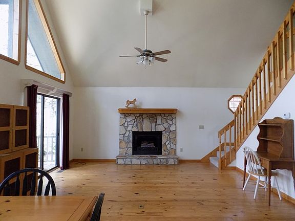 Wake up to the view each day ! Adorable chalet on a spring fed pond/lake. What a wonderful setting... Nice floorplan one covered porch and one open , great storage under home . Paved roads to your house . Some furnishings stay . Call for details.