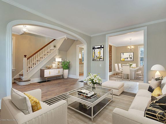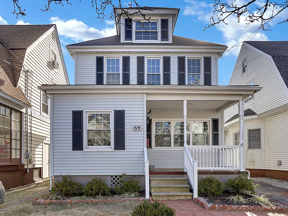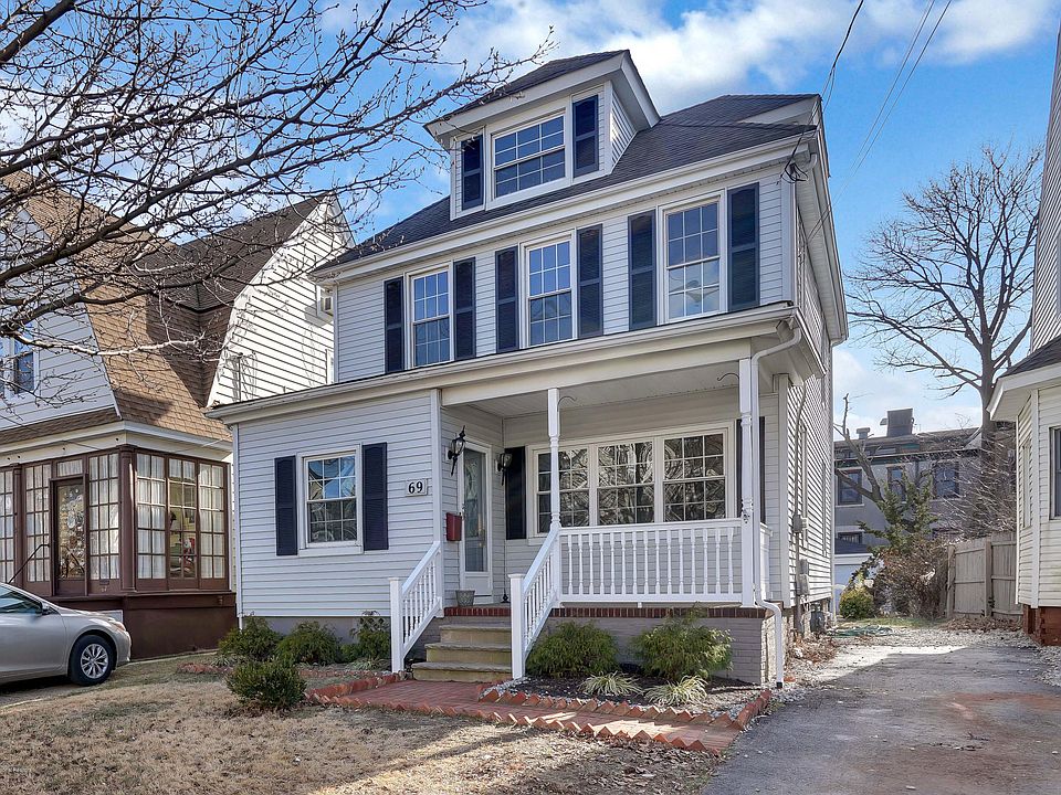 Don't miss out! Recently renovated, this spacious 3 floor Red Bank Colonial with rocking chair front porch is a commuter's dream home. Situated steps from the train and bus, you will enjoy the privacy of a single-family home while enjoying the action of downtown Red Bank. The first floor features a wonderful mudroom with coat closet, foyer opens up to a living room complete with large windows, and a spacious dining room. A brand-new kitchen with SS appliances, custom cabinets, quartz counters, and an exposed brick wall. The second floor has 3 bedrooms and a full bath. Stairs lead to a finished 3rd floor- great for an office, playroom, and lots of storage! Custom blinds on all windows on the first and second floor. Full basement with high ceilings, screened-in back porch, new AC recently installed. Beautiful fenced-in yard with paver patio, mature landscaping, and 2-car, detached garage.