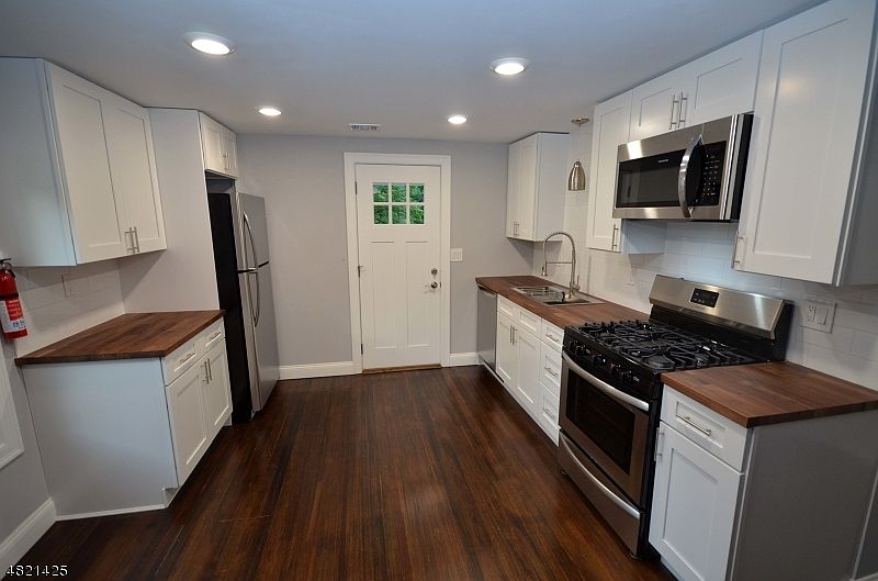 Move right in to this spacious and bright fully renovated 2BR apartment w/open floor plan, upscale designer finishes and impeccable craftsmanship. Eat-in kitchen boasts new SS Appliances, gorgeous new counter-tops and cabinets with subway tile back-splash. Hardwood floors throughout and new bathroom. Lower level has storage and W/D hook-ups.Tenant has use of yard and garage. Enjoy nearby shopping, restaurants, fitness centers, salons & more! Small dog is ok. Close to NYC bus stop. Landlord pays water, sewer and regular garbage pick up.