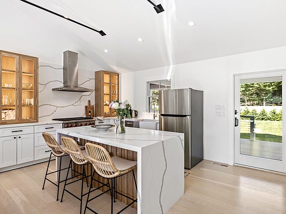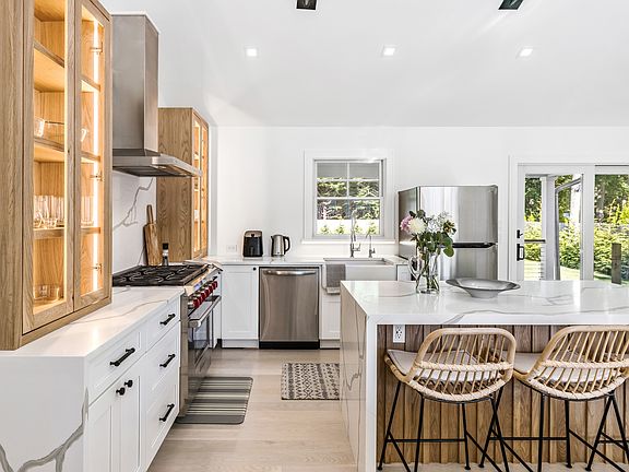 This beautifully renovated modern farmhouse offers a seamless blend of style and comfort. The main level offers an open layout featuring vaulted ceilings, island kitchen with custom cabinetry, quartz counter tops and stainless-steel appliances including a six-burner gas range with hood; An abundance of windows bring in plenty of natural light and the dining space boasts sliding glass doors connecting to the to the rear deck creating a seamless indoor/outdoor living concept. Off the hall there are three bedrooms and two and a half baths including an en-suite with walk in closet and direct access to the rear yard. The lower level has been beautifully finished and is equipped with a home gym, office space, recreation room and two additional bonus spaces flexible to your needs. Outdoors, you're greeted with a pristinely landscaped yard that is fully fenced in for the utmost privacy. There is a large, covered deck outfitted for relaxation, BBQ and al fresco dining, as well as a heated in ground gunite pool and outdoor shower. This home is impeccably furnished and equipped with all you need for an easy summer vacation. Conveniently located just moments from renowned ocean and bay beaches, waterfront dining and boutique shopping, as well as a short drive to Southampton and Westhampton Beach villages. An ideal summer getaway.