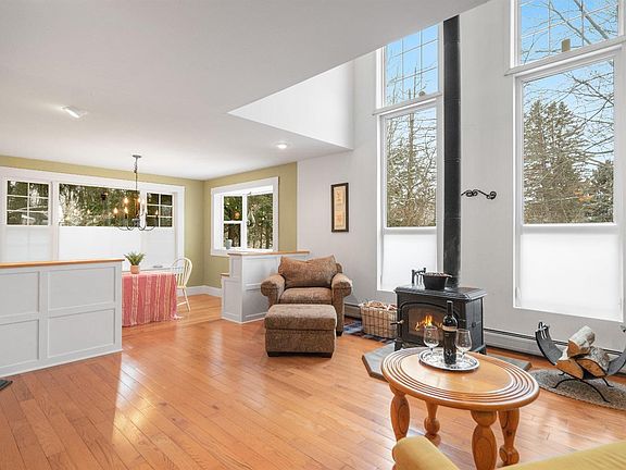 Vintage home that presents as a contemporary in wonderful Ellis Hollow. Large addition plus renovation in 2011 provides an exceptional property to fit multiple life styles. A fabulous kitchen with stainless appliances, granite counter-tops, Wolf range, and charming farmhouse sink efficiently passes through to a dining room which is flooded with light from a deep bay window and includes copious built-in storage. The two-story living room enjoys stunning sunsets and is always cozy from a wood stove, which can heat the entire house. Two bedrooms and full bath complete the main level. The second floor landing provides a large loft area great for family room or office. Two spacious bedrooms, each with their own full bath, a laundry room, and charming office nook complete this floor. Well sited on almost three wooded acres with berry bushes, fruit trees, fenced, raised-bed gardens, and sweet shed, this gem is minutes to Cornell and the Arboretum.