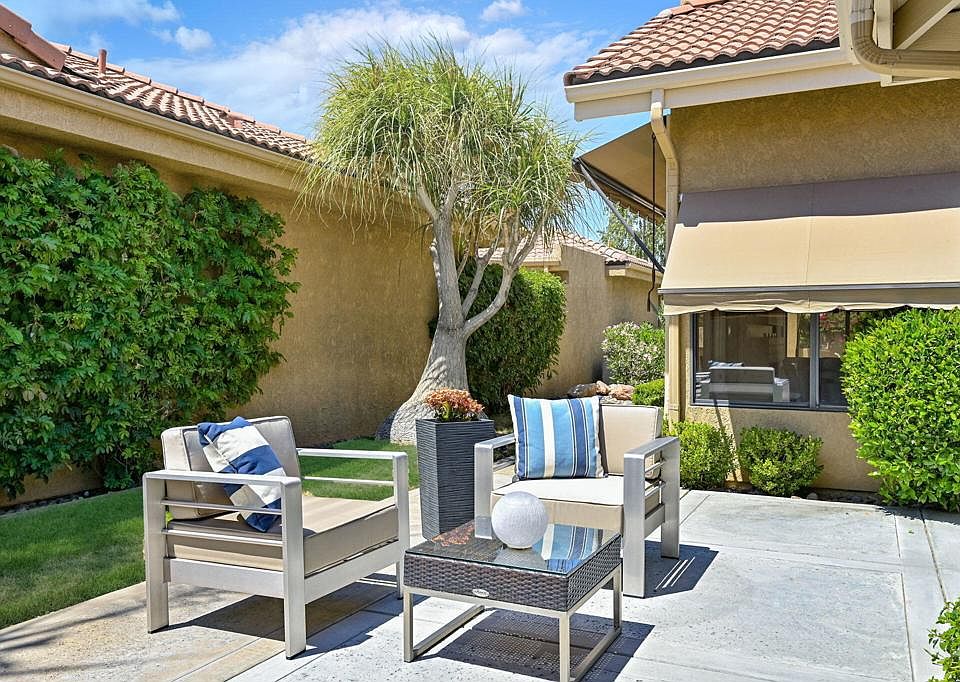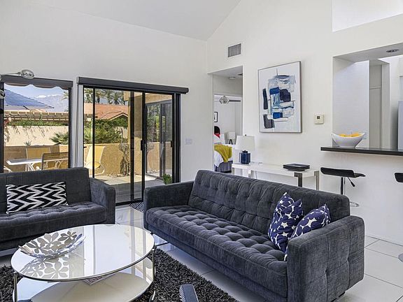 Lovely sunny and bright Silver Sands Racquet Club home - the sought after G Model with 2 Master Suites. This 1070 SF 2 BR | 2 BA home with 2 car garage, has an open floor plan with sleek tile floors, gas fireplace, dining area, galley kitchen with bar area seating. Kitchen and baths were updated in the past 5 years or less. Furnished in an attractive, contemporary Palm Springs style, and sold with some furnishings, per inventory list. Private courtyard off entrance to home has seating area - complete with a unique Elephant Palm Tree. Living room and Master Bedroom open to a very expansive patio area, with lots of of seating and entertaining area for barbequing, relaxing and lovely mountain views. Silver Sands is a Desert Gem and sits in a great location, adjacent to the Desert Springs Marriott golf course. This community offers amenities of a clubhouse, 7 lighted tennis and 4 pickleball courts with pro staff during season, fitness center and 15 pools/spas. HOA dues include trash, cable and internet, roof and exterior home maintenance and common area maintenance and your use of clubhouse and tennis/fitness club. No extra charges for membership. Don't miss out on this amazing home! Seller has paid the special assessment!
