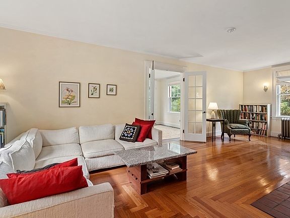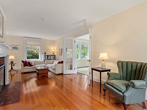 This classic 1925 Colonial sits far back from the road on 2.7 acres of level land in desirable south Wayland. Walk to the Town beach on Lake Cochituate, the Cochituate baseball park, CVS, P.O., banks, restaurants, a grocery store, churches and more. Hardwood floors throughout. The front-to-back living room has a charming fireplace. From the living room, French doors lead to a sunroom. The dining room features a walk-out bay and a built-in china cabinet. The kitchen has a small peninsula, marble and s/s countertops, a charming breakfast nook and pantry. A half bath is off the kitchen and a tiled mudroom leads to a small deck and a very large private backyard. From the front entry, a central staircase leads up to 4 bedrooms, a full bath, a large window seat in the hallway and access to the attic with potential for finishing. Behind the house there are two 2-car garages and a detached playhouse/studio. Wayland schools are top-rated. Easy access to MA Pike and other commuting routes.