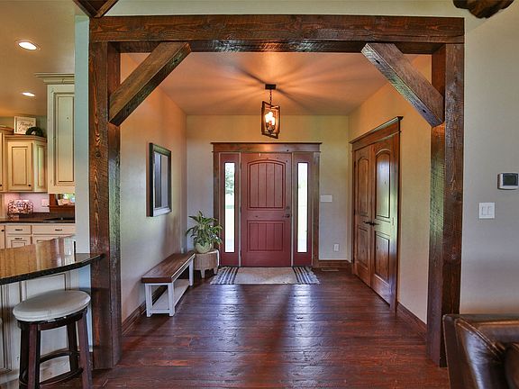 Custom beam work greets you on the covered front porch, entering into a generous foyer with large coat closet and beautiful circle sawn fir flooring. Gorgeous, wide rustic alder trim and doors accentuate the open floor plan. Custom fantastic antiqued rustic alder cabinets are aesthetic & work wise with a Costco/Trader Joe pantry near. Loads of formica counter space with Gemloc edging, including ample seating, are ready for your amazing kitchen creations. Main floor master suite with walk-in closet and soaking tub with a view.
