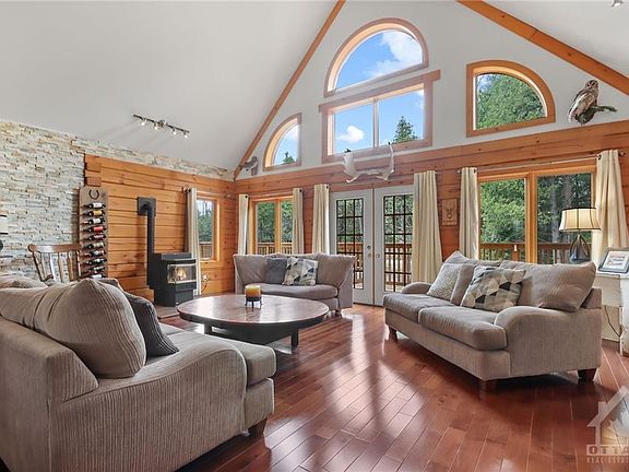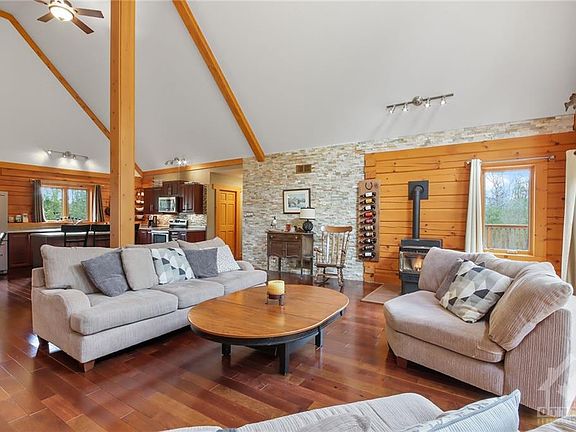 This dream home is on a picturesque 9.2-acre lot in the middle of the woods. This beautiful chalet style log home is heated by an efficient air-to-air heat pump, ensuring that you stay comfortable year-round. For those chilly winter nights, an outdoor wood furnace is also available as a backup heating source, along with a propane system for added warmth and convenience. The grand living/dining room features a cozy fireplace and large windows that fill the space with natural light and is perfect for entertaining family and friends. The kitchen boasts plenty of counter space, custom cabinets, and stainless steel appliances. The primary suite offers a walk-in closet and luxurious private bath, where you can unwind in the oversized soaking tub after a long day of playing in the woods surrounding the property. The second bed suite offers a private area for family or guests. Enjoy the expansive deck or play/work in the separate detached garage. See attachment for more important details.