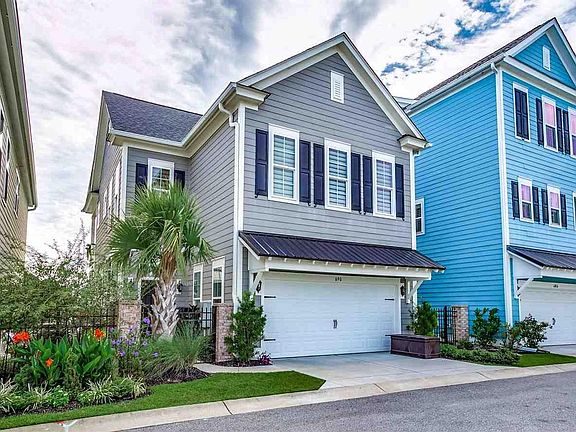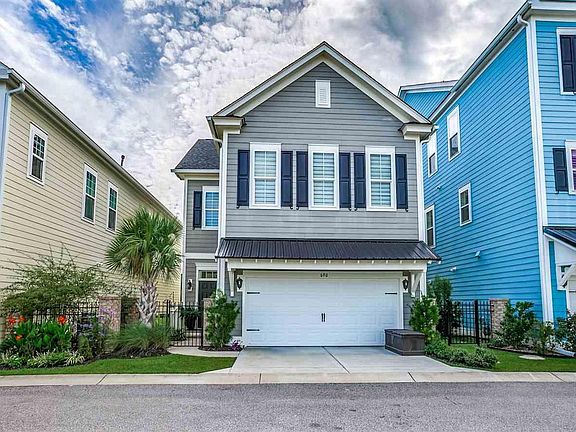 Want to live on the lakefront with a short walk or golf cart ride to the beach? Close to shopping, dining, sports complex, park, movie theater and much more? Welcome Home! This beautiful 3 br/2.5ba Charleston style home was custom finished by the owners. When you walk through the back gate, you know you are in paradise. There is a lovely cobblestone patio with plenty of room to entertain and it is lined with lush landscaping and flowering plants everywhere! There is a large water feature and you can see straight through to the lake out front. These are some of the premiere homes of Market Commons and the first ones you see entering from Bus 17. There are two porches on the front of the house, one upstairs and one down and also a side porch. You have great views of the lake from multiple vantage points inside the home including the dining room and the Master bedroom. The rich dark laminate flooring is carried throughout the house with tile in the wet areas. The living room has a cozy fireplace for cool winter nights. The kitchen hosts white cabinets, some with glass and lighting and black granite countertops. The cooktop has a retractable vent. Upstairs, the Master bedroom has a large walk-in closet and roomy Master bath with all the upgrades. The other two bedrooms share a bath and you have a half bath downstairs. Your two car garage has easy access. The Sellers have already added gutters to this home so you can enjoy sitting on the porches even when it is raining. Take a peak at what paradise looks like!
